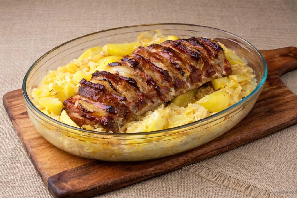 Un preparat satios, aromat si perfect pentru mesele de familie: cotlet fraged, marinat in bere, copt lent alaturi de varza acra, cartofi si bacon. O reteta cu gust bogat, care aduna pe toata lumea la masa.
