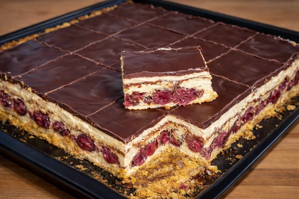 O prajitura decadenta, cremoasa, cu contrast perfect intre ciocolata, vanilie si visine – genul de desert care dispare primul de pe masa.