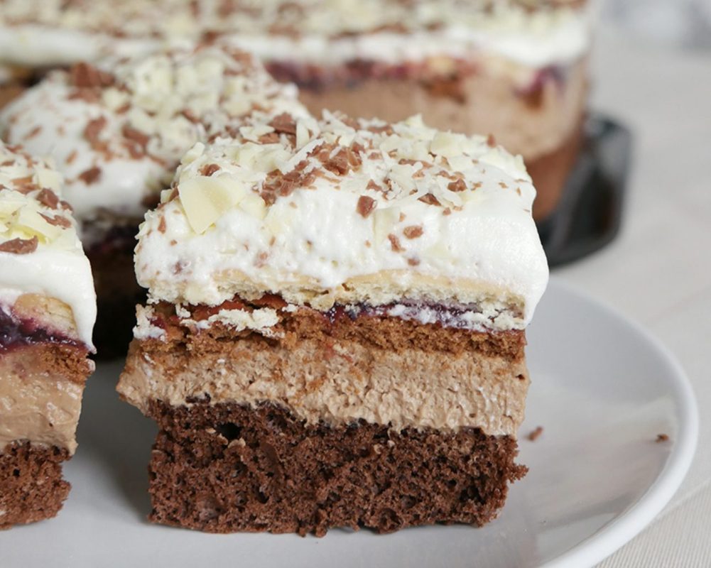Această prăjitură este un desert cremos în straturi: blat pufos de cacao, un strat generos de cremă ciocolatoasă cu aromă fină de cafea, biscuiți crocanți, gem acrișor de coacăze și un nor de cremă fină de frișcă. Un deliciu spectaculos, dar ușor de preparat!