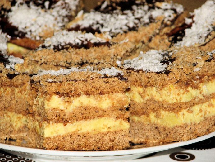 Asambleaza prajitura alternand foile cu crema calda. Apasa usor dupa fiecare strat, astfel incat foile sa se aseze si sa absoarba aroma cremei. La final, topeste ciocolata de post cu uleiul si intinde glazura uniform. Presara fulgi de cocos deasupra.