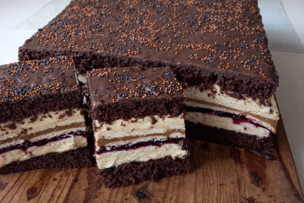 Un desert decadent, cu blat pufos de ciocolata, crema fina, biscuiti fragezi, caramel si gem acrisor.
