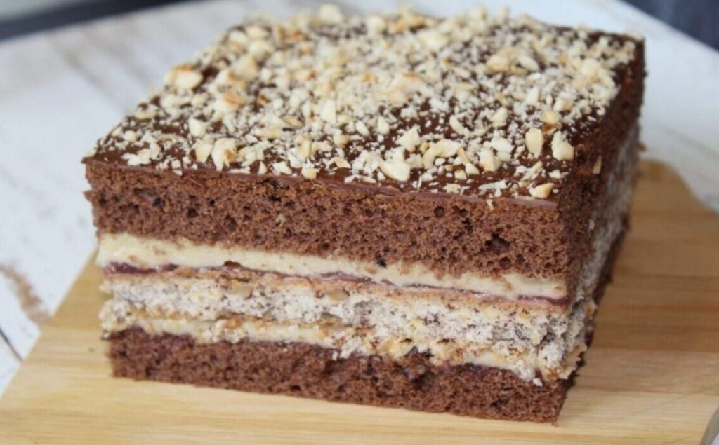Prajitura din imagine este un desert spectaculos, cu straturi colorate si texturi diferite: blat pufos cu cacao, foi crocante cu nuca si o crema fina de vanilie. Totul este 100% de post, fara lactate sau oua – perfecta pentru zilele de post sau pentru orice moment cand vrei un desert elegant si aromat.