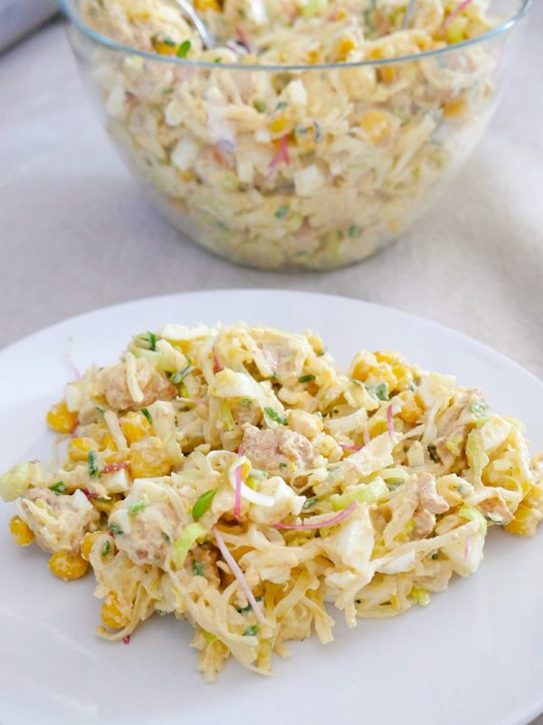 Intr-un bol mare pune: puiul, ouale, cascavalul, porumbul, telina, ananasul, prazul si ceapa verde.